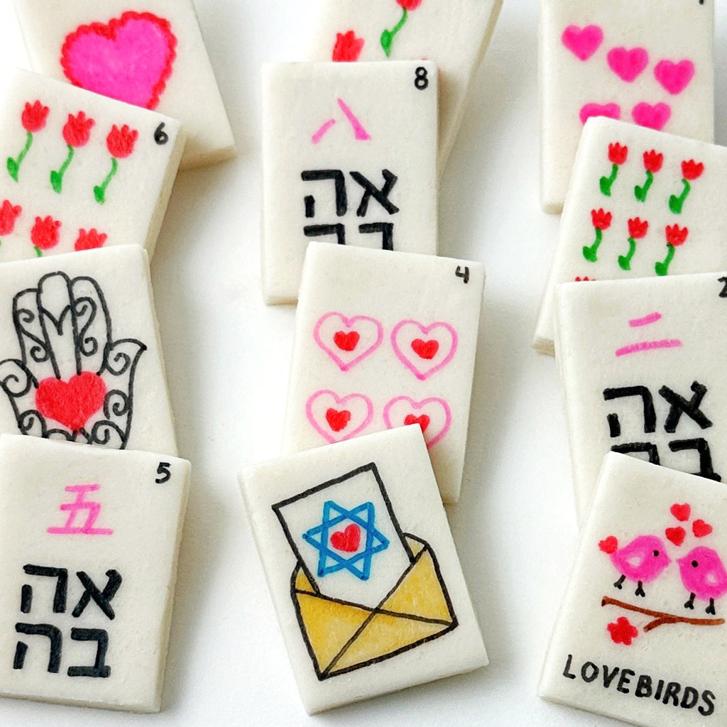 Mahjong meets Valentine's Day meets Jewish love and Tu B'av in this handcrafted marzipan tile set, designed to bring fun, tradition, and a little sweetness to the holiday. An amazing gift and dessert table highlight, and inspired by the timeless game loved by many, each one of our beautiful and delicious marzipan tiles is meticulously designed to bring love and Valentine's Day to life!