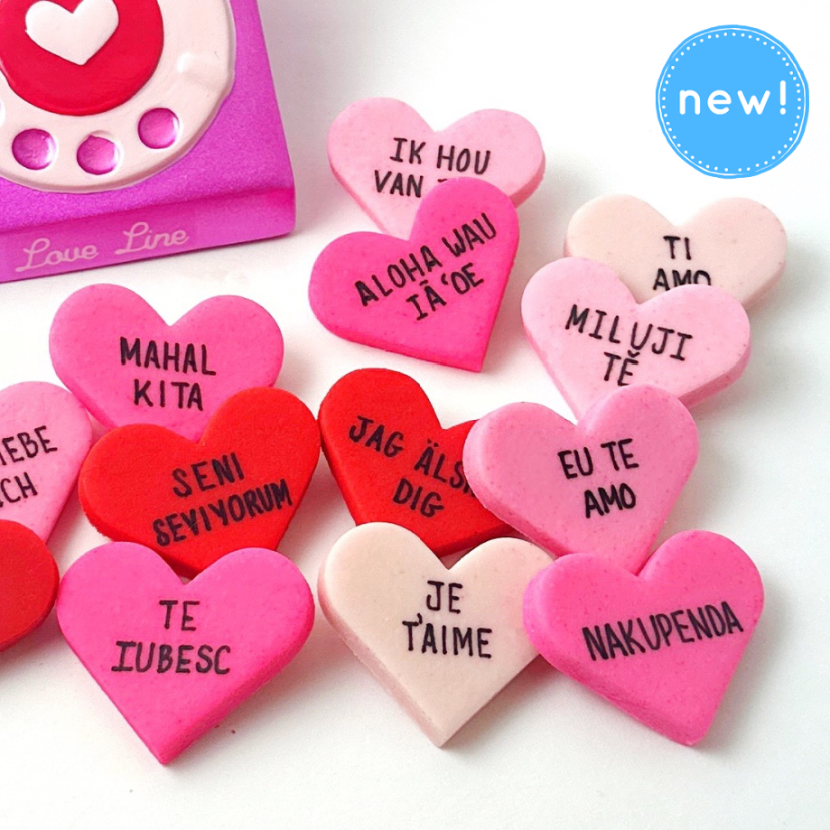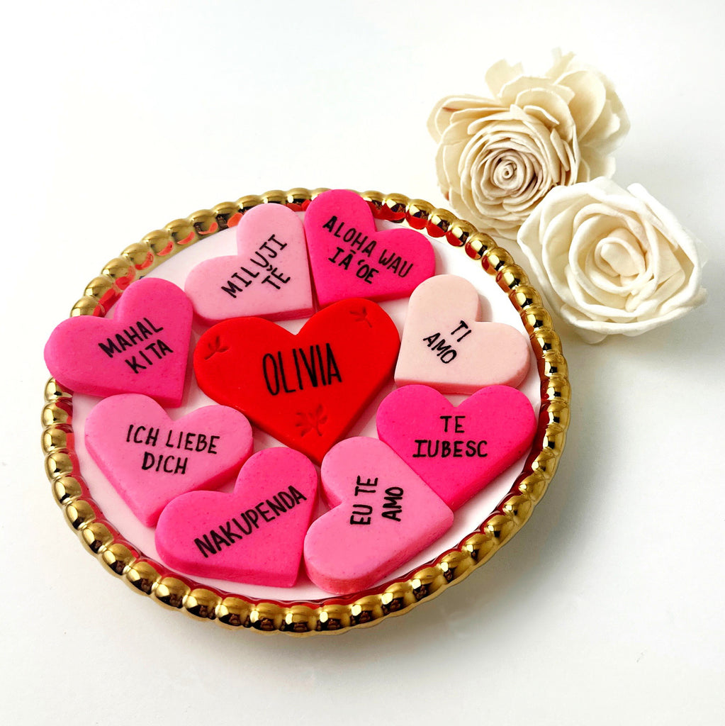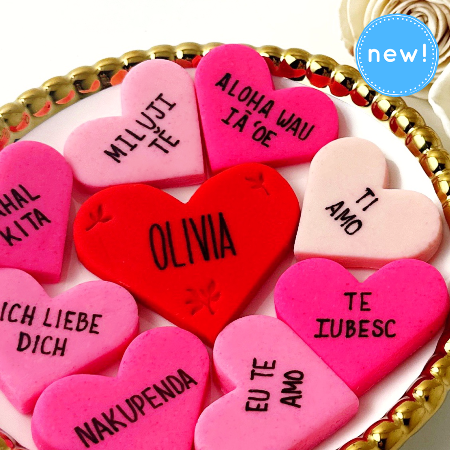 What you will get: A gift box with 10 global "I love you" conversation heart tiles in 10 assorted languages that we will curate, or a gift box with 1 large personalized heart together with 8 global "I love you" conversation heart tiles in 8 assorted languages. lf including the personalized heart, please be sure to leave a note in your shopping cart with the name or e-mail us separately. Please limit your names/words to 12 characters, including spaces. Also, if there is language shown that you must have in your assortment, please let us know.