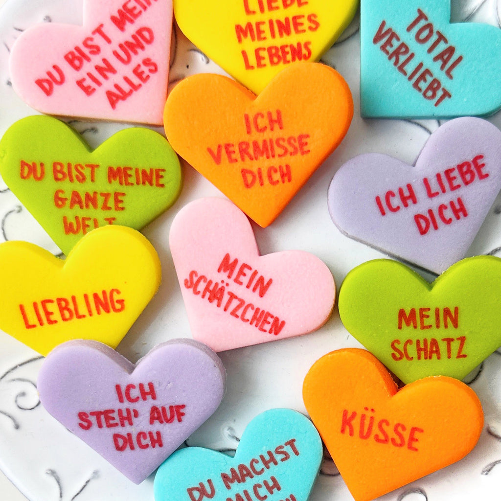The traditional candy for Valentine's Day is recreated in delicious marzipan - and now in German! Candy heart tiles - with quirky and fun sayings hand-written with edible ink - are great to share and fun to eat. Frohen Valentinstag!